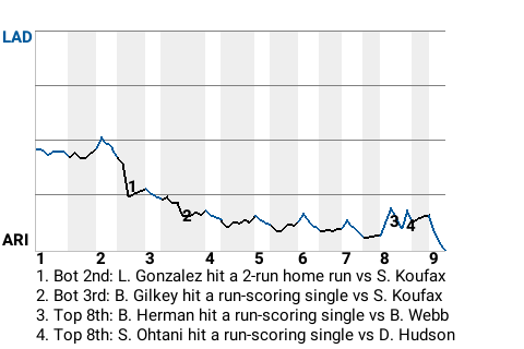 With scoring opportunities rare, the Diamondbacks had to cash in when they had the chance. One such opportunity presented itself in the bottom of the third, when left fielder Bernard Gilkey hit a run-scoring single. The single came off Sandy Koufax and made the score 3-0, Diamondbacks. Gilkey went 2 for 4 with 2 singles.