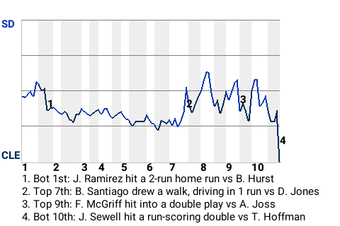 The decisive blow was delivered by Joe Sewell in the bottom of the tenth when he hit a run-scoring double off 30-year old right-handed pitcher Trevor Hoffman to win the game for Cleveland. The home crowd went nuts.