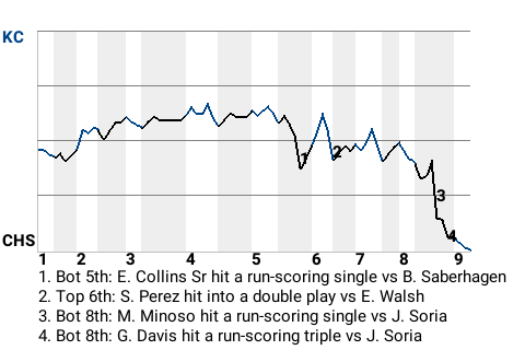 The game was at a stalemate until left fielder Minnie Minoso came to bat in the bottom of the eighth. Facing Kansas City pitcher Joakim Soria, he hit a 2-0 fastball for a run-scoring single. It was a game-changer, putting Chicago on top, 2-1.