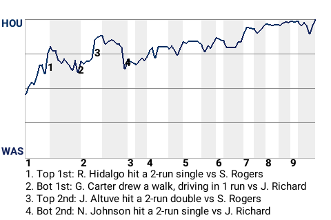 Houston center fielder Richard Hidalgo contributed a timely at-bat in the top of the first. With two down, he hit a sinker to center field for a 2-run single. It was his 24th hit of the season and put the Astros ahead, 3-0.