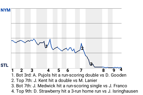 Yadier Molina had a big 2-run home run for the Cardinals in the bottom of the seventh inning. With St. Louis leading 3-0 and a runner on 2nd, he got a changeup from John Franco and swatted a home run to right. It was his 2nd home run of the season, and more importantly, it put the Cardinals ahead, 5-0.