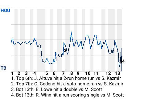 The Rays got a clutch hit from left fielder Randy Winn. In the bottom of the 13th, he delivered a run-scoring single to win the game for the Rays.