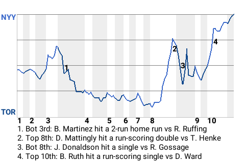 The game was at a stalemate until left fielder Babe Ruth came to bat in the top of the tenth. Facing Toronto pitcher Duane Ward, he hit a full count fastball for a run-scoring single. It was a game-changer, putting New York on top, 6-5.