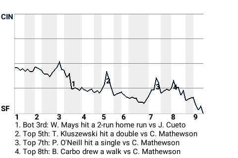 In the bottom of the third, slick-fielding center fielder Willie Mays hit a 2-run home run. The 10th home run of the season for the San Francisco center fielder put the Giants on top, 2-0.