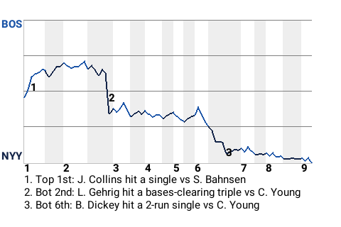 Lou Gehrig hit a bases-clearing triple off Cy Young in the bottom of the second, which put the Yankees in front, 3-2. Gehrig had 1 single, in addition to the triple. For the game, he went 2 for 4.