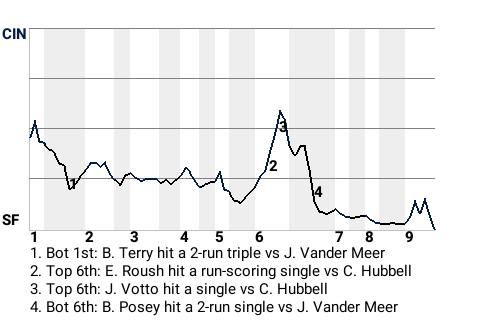 San Francisco catcher Buster Posey helped the Giants go up, 4-2, in the bottom of the sixth inning. With the game tied, Posey hit a 2-run single off Cincinnati pitcher Johnny Vander Meer.