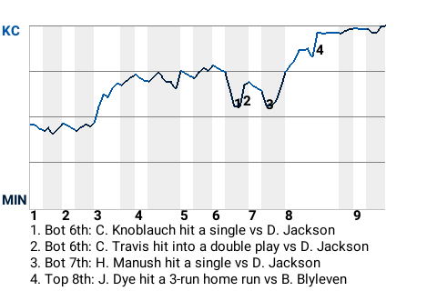 Kansas City used the clutch hitting of Jermaine Dye to snag the win. The right fielder drilled a 3-run home run in the top of the eighth inning to put the Royals ahead, 5-1. It was his lone hit in 2 at-bats, but it was a crucial one.