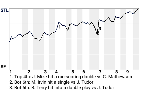 St. Louis pitcher John Tudor did his part in helping his team defeat the San Francisco Giants, 2-0. The opposition could never get too much going against the left-hander. The winner was Tudor. He threw 6.2 innings of shutout ball. The loser was Christy Mathewson. Today's win puts St. Louis at 47-38, while San Francisco falls to 50-34.