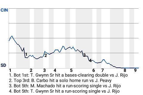 Early in the game, left fielder Tony Gwynn Sr had a bases-clearing double for San Diego. It was his 21st double of the season and put the Padres on top, 3-0.