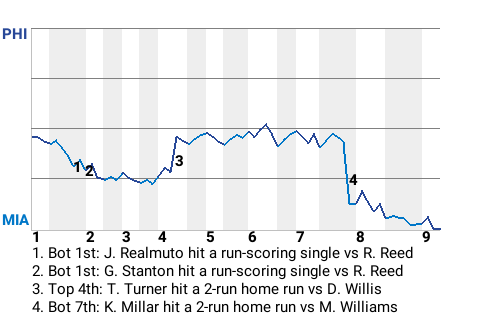 Miami took a 4-2 lead on Kevin Millar's 1st home run of the season. The 2-run home run, which Millar hit in the bottom of the seventh, left Philadelphia pitcher Mitch Williams shaking his head.