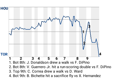 The clutch at-bat came in the bottom of the ninth inning, when Toronto designated hitter Bo Bichette, facing Xavier Hernandez, had a run-scoring sacrifice fly. It gave the Blue Jays the 3-2 win.