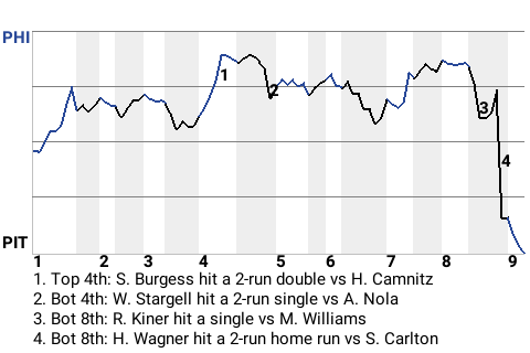 Pittsburgh went in front, 7-6, on Honus Wagner's 5th home run of the season. The 2-run home run, which Wagner hit in the bottom of the eighth, left Philadelphia pitcher Steve Carlton visibly perturbed.