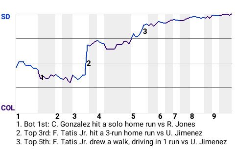 Tatis Jr. contributed a big hit, a 3-run home run, for San Diego in the top of the third. With his team trailing 1-0, Tatis Jr. took a curveball from Ubaldo Jimenez and stroked the home run to left. His 18th home run of the season allowed the Padres to leap in front, 3-1.