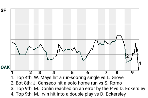Oakland took the lead, 5-4, on Jose Canseco's 32nd home run of the season. The solo home run came off San Francisco pitcher Sergio Romo in the bottom of the eighth.