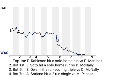 Spike Owen hit a run-scoring triple off Dave McNally in the bottom of the fifth, which put the Nationals in front, 2-1. Owen had 1 single, in addition to the triple. For the game, he went 2 for 4.