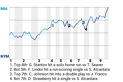 Giancarlo Stanton had a big solo home run for the Marlins in the top of the fourth inning. With Miami leading 1-0 and the bases empty, he sized up a sinker from Tom Seaver, who is tied for 10th in the NL with a 7.9 K/9 rate, and punished it. The result was his 14th home run of the season, which put the Marlins on top, 2-0.