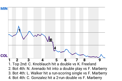Carlos Gonzalez had a big 2-run double for the Rockies in the bottom of the fourth inning. With Colorado leading 1-0 and runners on 1st and 3rd, he got a changeup from 30-year old right-handed pitcher Firpo Marberry and swatted a double to right-center. It was his 20th double of the season, and more importantly, it put the Rockies ahead, 3-0.