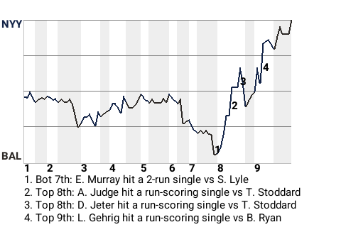 The game was at a stalemate until first baseman Lou Gehrig came to bat in the top of the ninth. Facing Baltimore pitcher B J Ryan, he hit a 1-2 changeup for a run-scoring single. It was a game-changer, putting New York on top, 6-5.