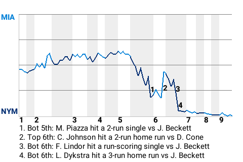 New York took control in the bottom of the sixth. With one out and runners on 1st and 2nd, Francisco Lindor hit a run-scoring single to make it 4-3, Mets.