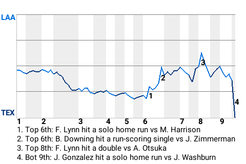 Texas got a clutch hit from Juan Gonzalez. The pinch hitter launched a solo home run in the bottom of the ninth inning to win the game. It was his only hit in 1 at-bat, but it was a kill shot.