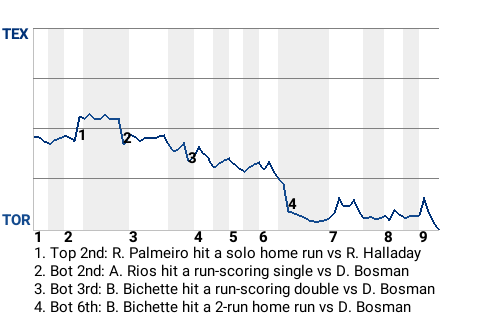 Despite a fine performance by first baseman Rafael Palmeiro, the Texas Rangers lost to the Toronto Blue Jays, 5-4. Palmeiro belted 2 home runs. He drove in 3 runs and scored twice. Roy Halladay earned the win for Toronto. He lasted 7.2 innings, allowing 3 runs on 6 hits, while striking out 7. With the win, he raised his record to 13-5.