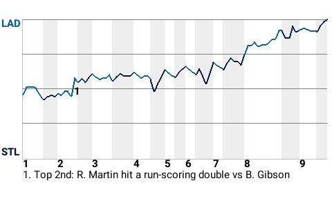 Early in the game, catcher Russell Martin had a run-scoring double for Los Angeles. It was his 2nd double of the season and put the Dodgers on top, 1-0.