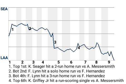 Lynn contributed a big hit, a 3-run home run, for Los Angeles in the bottom of the fourth. With his team trailing 2-1, Lynn took a curveball from Felix Hernandez and stroked the home run to left. His 11th home run of the season allowed the Angels to leap in front, 4-2.