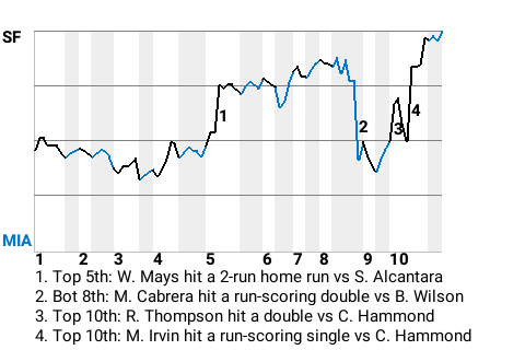 The game was at a stalemate until left fielder Monte Irvin came to bat in the top of the tenth. Facing Miami pitcher Chris Hammond, he hit a 2-2 fastball for a run-scoring single. It was a game-changer, putting San Francisco on top, 4-3.
