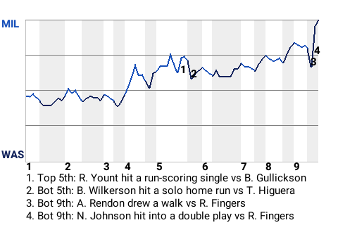 The Milwaukee Brewers went home winners at Nationals Park, thanks in large part to starter Teddy Higuera. Higuera stifled the Washington Nationals, enabling Milwaukee to grab the 2-1 win. Higuera yielded 1 run over 7 innings to notch the win. He scattered 2 hits, walked 6, and struck out 4. His record improves to 8-7. After today's action, Milwaukee sits at 55-44, while Washington falls to 41-57.