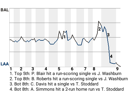 With shortstop Andrelton Simmons leading the charge, the Los Angeles Angels defeated the Baltimore Orioles, 4-2, at Angel Stadium of Anaheim. Simmons, who is tied for 5th in the AL in hits with 113, was 3-3 with a home run, 2 singles, and a walk, while adding 2 RBI and scoring once. Troy Percival finished the game for Los Angeles and earned his 15th save. The last-place Orioles dropped to 43-56.