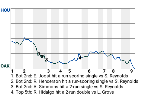 Al Simmons dealt the Astros a blow in the bottom of the second. Batting with runners on 2nd and 3rd and Oakland leading 2-0, Simmons, who is tied for 6th in the AL with a .303 batting average, hit a 0-1 fastball for a 2-run single.