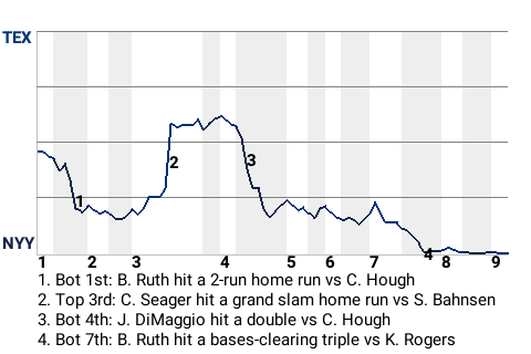 With New York leading 6-4 in the bottom of the seventh, Ruth came up to bat against Texas pitcher Kenny Rogers. Ruth hit a slider to right-center for a bases-clearing triple. His 6th triple of the season put the Yankees on top, 9-4.