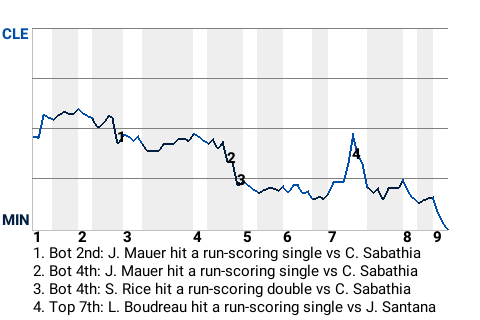 Sam Rice had a big run-scoring double for the Twins in the bottom of the fourth inning. With Minnesota leading 2-1 and a runner on 1st, he got a fastball from CC Sabathia and swatted a double to right. It was his 16th double of the season, and more importantly, it put the Twins ahead, 3-1.