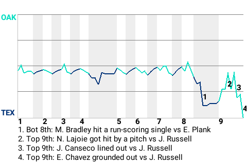 The game was at a stalemate until center fielder Milton Bradley came to bat in the bottom of the eighth. Facing Oakland pitcher Eddie Plank, he hit a 3-1 fastball for a run-scoring single. It was a game-changer, putting Texas on top, 1-0.