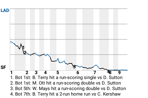 The San Francisco Giants knocked off the Los Angeles Dodgers, 7-0, at AT&T Park. Bill Terry was a big reason San Francisco won. The first baseman was 4-4 with a home run, a triple, and 2 singles. He scored 3 times and drove in 3. The Giants are now 59-46.