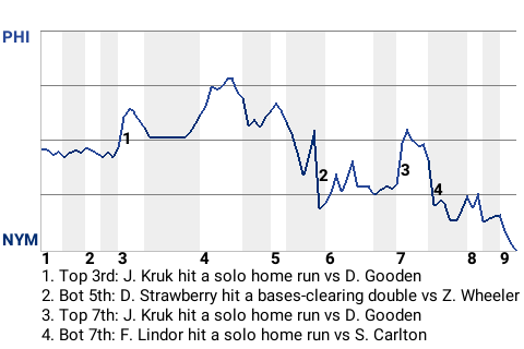 The New York Mets withstood an impressive performance by Philadelphia first baseman John Kruk to defeat the Phillies, 5-4, at Citi Field. Kruk was 2-4 with 2 home runs. John Franco earned the save for New York, his 7th. With the win, New York upped its record to 58-49.