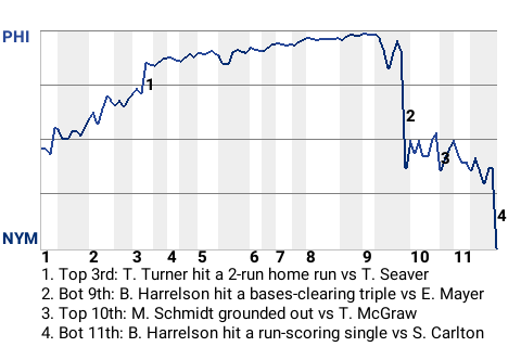 The New York Mets overcame a pretty good performance by Philadelphia second baseman Trea Turner, beating the Phillies, 5-4, in 11 innings. Turner hit 2 home runs. He drove in 3 runs and scored twice. With the win, New York pushed its record to 59-49.
