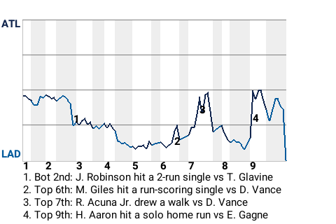 In the bottom of the second, with two out and the game tied, 0-0, speedster Jackie Robinson won it for Los Angeles. With the bases loaded, Robinson hit a first pitch sinker from Tom Glavine for a 2-run single, giving his team the 2-0 win.