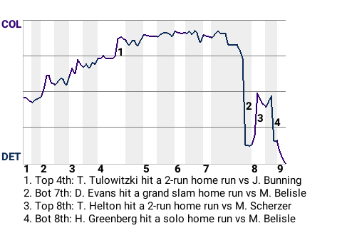 The inspired effort of Colorado first baseman Todd Helton was not enough to prevent a loss, 7-6, to the Detroit Tigers. Helton was 3 for 4 with a home run and 2 singles. He scored 2 times and drove in 2. Max Scherzer earned the win after being brought in from the bullpen. The right-hander allowed 2 runs on 2 hits in 2.1 innings. His record is now 3-2.