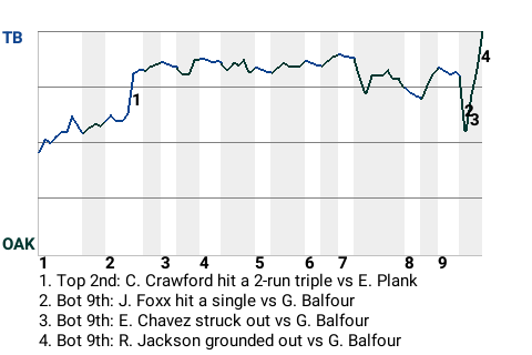 The Tampa Bay Rays had to overcome a fine effort from Oakland pitcher Eddie Plank to win, 4-3, at O.co Coliseum. Plank went 8 innings and allowed 4 runs. Grant Balfour earned save number 22. Tampa Bay is 4th in the American League Eastern Division with a record of 50-63.