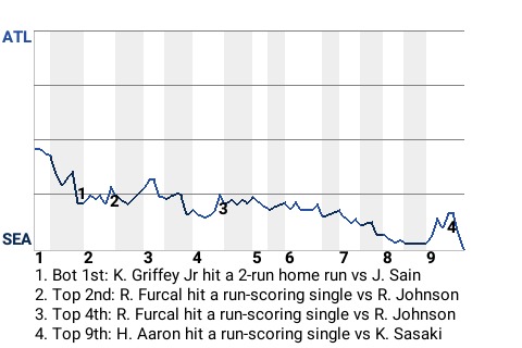 With Seattle leading 1-0 in the bottom of the first, Griffey Jr came up to bat against Atlanta pitcher Johnny Sain. Griffey Jr hit a fastball to left for a 2-run home run. His 24th home run of the season put the Mariners on top, 3-0.
