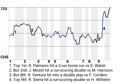 The Texas Rangers faced a tough opponent in Chicago pitcher Ed Walsh, but did just enough to pull out the victory at U.S. Cellular Field by a final score of 4-2. Walsh went 7.1 innings and allowed 2 runs. The winner was Francisco Cordero in relief. His record improves to 3-2. Hoyt Wilhelm took the loss. Texas is now 47-67.
