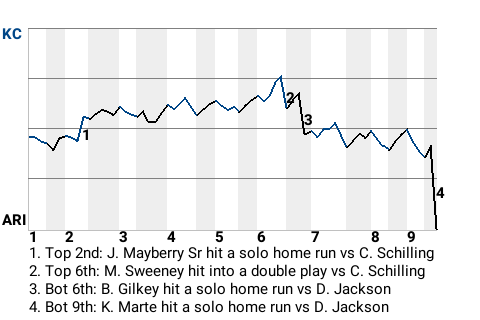 Starting pitcher Curt Schilling was a major factor in the 2-1 Arizona Diamondbacks triumph over the Kansas City Royals. Daniel Hudson, credited with the win, is now 3-3. He allowed no runs on no hits in 1.2 innings. Arizona now owns a record of 48-66.