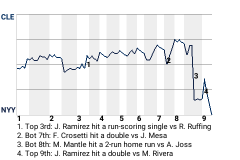New York registered a win at Yankee Stadium by beating the Cleveland Indians, 3-2. Pitcher Red Ruffing was one reason why the Yankees triumphed. New York reliever Rich Gossage picked up the win, while Addie Joss took the loss for Cleveland. Earning his 34th save for New York was Mariano Rivera.