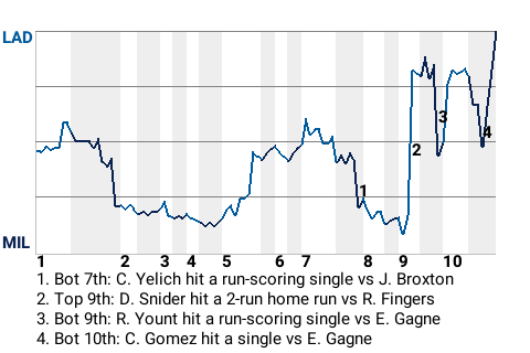 Gil Hodges drove in one run for Los Angeles. With no one out and the game tied in the top of the tenth inning, Hodges had a clutch at-bat. Facing Milwaukee hurler Rollie Fingers, he hit a sacrifice fly to give the Dodgers a 7-6 lead.