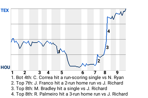 Palmeiro had a game-changing home run in the top of the eighth. On a 1-1 fastball from J R Richard, he banged a 3-run home run to right, giving the Rangers a 6-4 lead. It was the 17th home run of the year for Palmeiro.