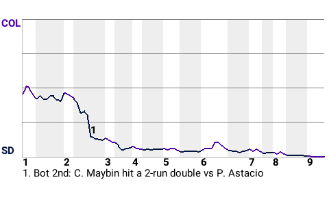 Cameron Maybin had a big 2-run double for the Padres in the bottom of the second inning. With San Diego leading 1-0 and runners on 1st and 2nd, he got a fastball from 24-year old right-handed pitcher Pedro Astacio and swatted a double to right. It was his 3rd double of the season, and more importantly, it put the Padres ahead, 3-0.