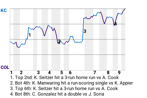 Seitzer had a game-changing home run in the top of the sixth. On a 2-1 sinker from Aaron Cook, he banged a 3-run home run to left-center, giving the Royals a 6-3 lead. It was the 7th home run of the year for Seitzer.