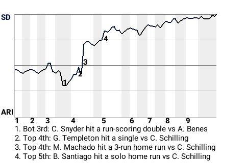 With San Diego trailing 1-0 in the top of the fourth, Machado hit a fastball from Curt Schilling for a 3-run home run. It was his 19th home run of the season and put the Padres ahead, 3-1.