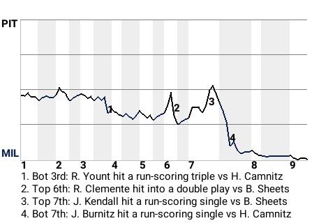 Milwaukee took control in the bottom of the seventh. With no one out and runners on 1st and 2nd, Jeromy Burnitz hit a run-scoring single to make it 2-1, Brewers.